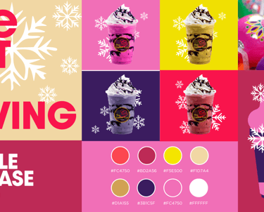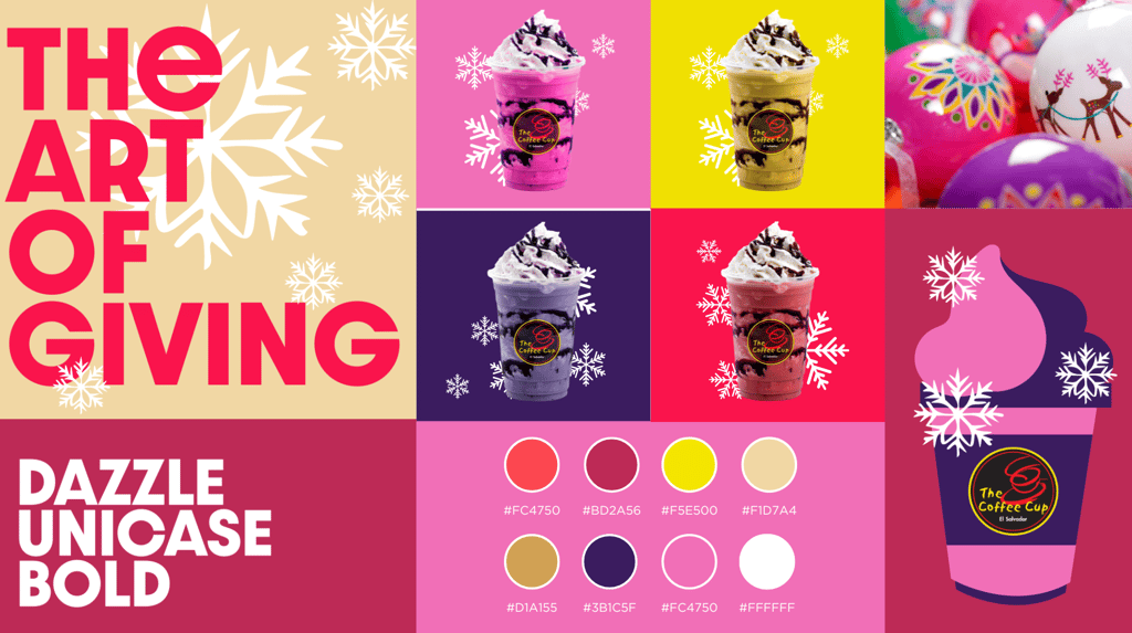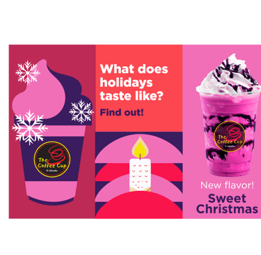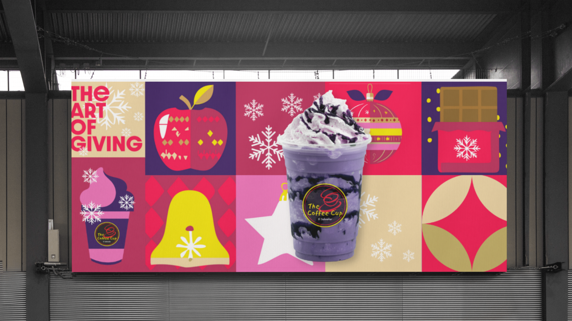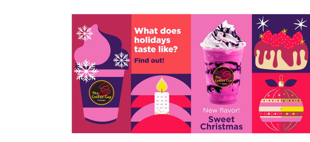 A key rule guided our concept: no green. Since the main competitor, Starbucks, has built its identity around that color family, we intentionally shifted toward fresh variations of the brand’s own reds and yellows. This not only reinforces brand recognition but also positions The Coffee Cup with a distinct and memorable holiday personality.