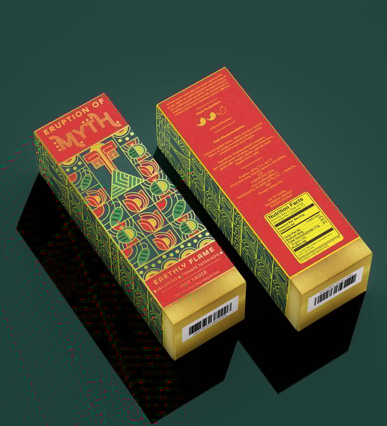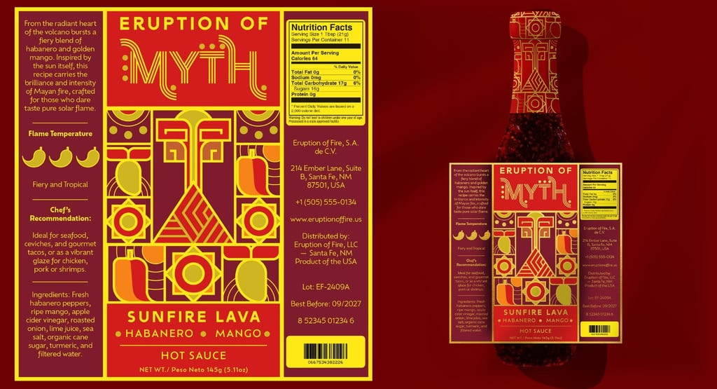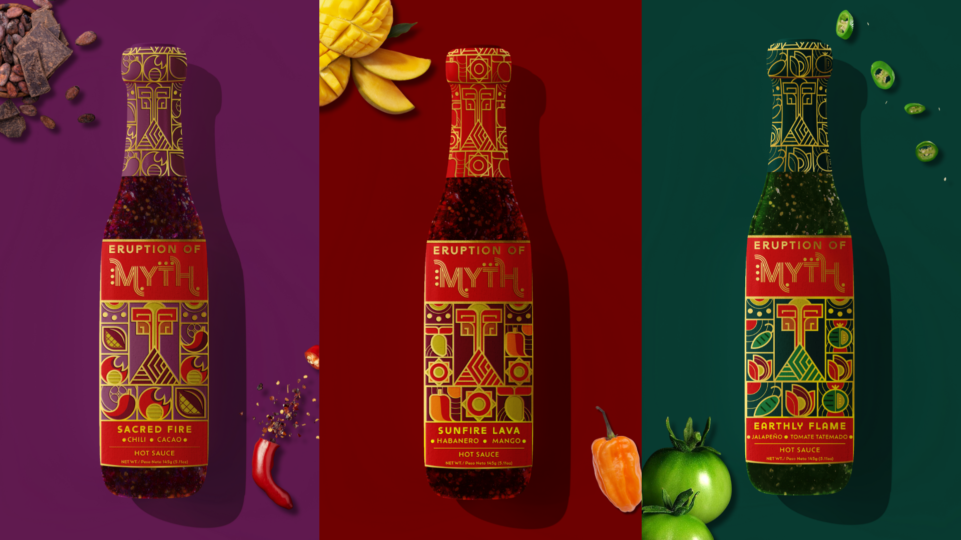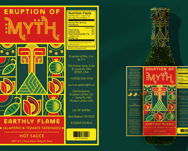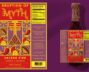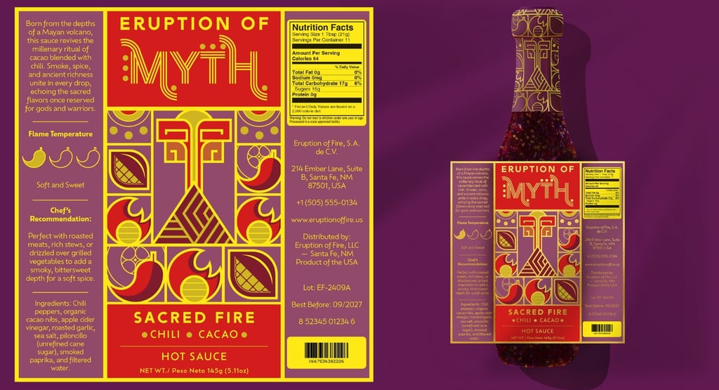 The Eruption of Myth collection was born from the desire to transform artisanal hot sauces into a gourmet experience that celebrates cultural heritage and luxury design. Inspired by Mayan traditions and millenary recipes, each sauce highlights ancestral ingredients — from cacao and chili to habanero with mango and roasted jalapeños with tomatoes. The volcanic imagery became the unifying metaphor, symbolizing both the origin of fire and the explosive intensity of flavor.