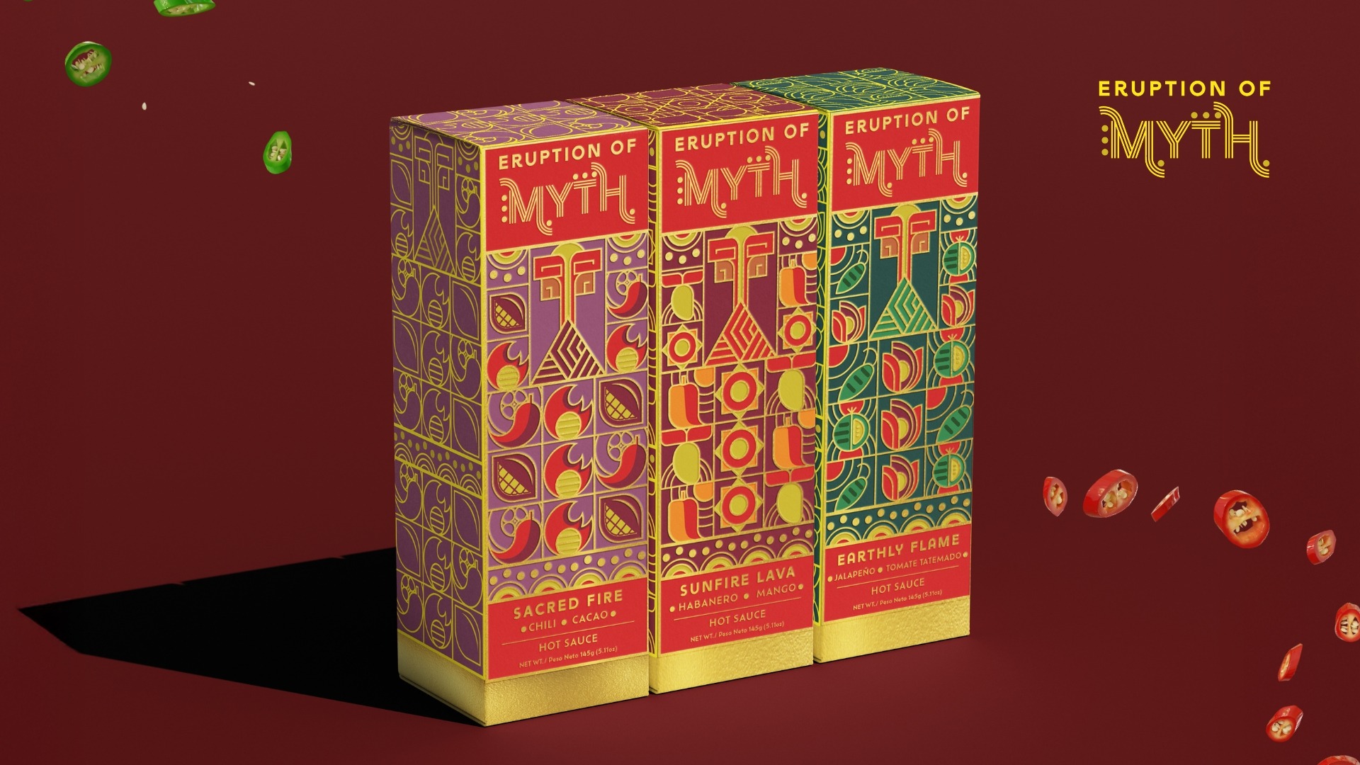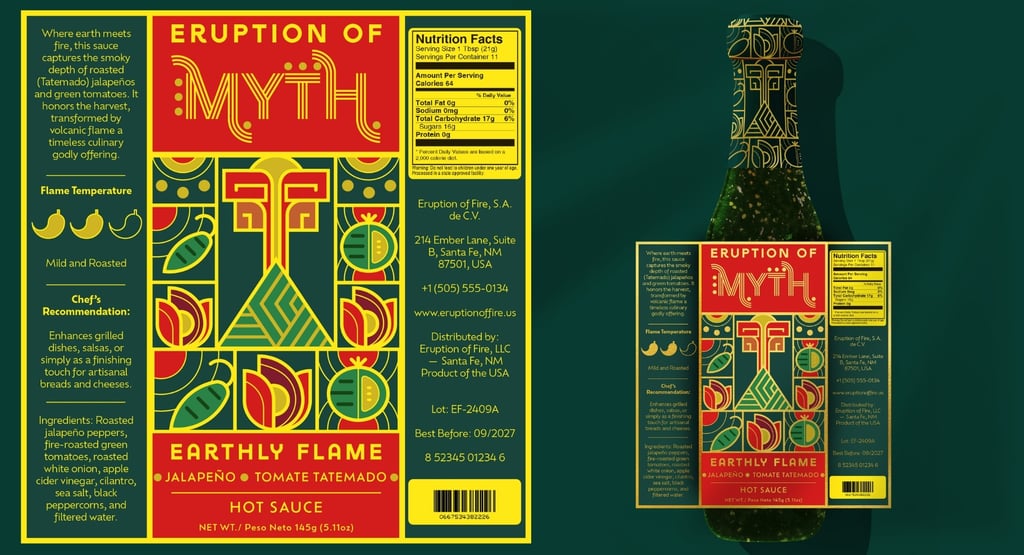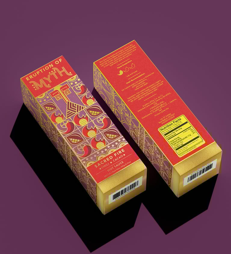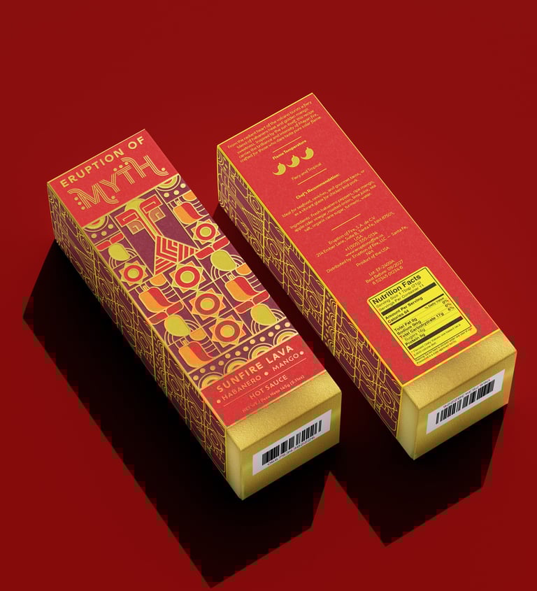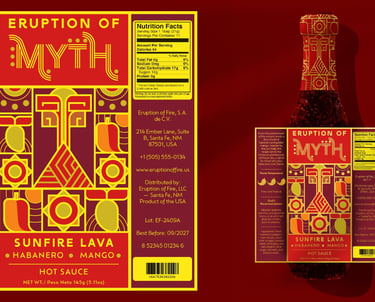 The Eruption of Myth collection was born from the desire to transform artisanal hot sauces into a gourmet experience that celebrates cultural heritage and luxury design. Inspired by Mayan traditions and millenary recipes, each sauce highlights ancestral ingredients — from cacao and chili to habanero with mango and roasted jalapeños with tomatoes. The volcanic imagery became the unifying metaphor, symbolizing both the origin of fire and the explosive intensity of flavor.